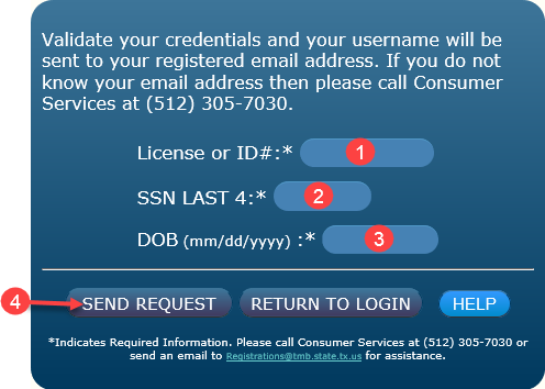 - Click “SEND REQUEST” to validate your credentials and have the username sent to your email address.